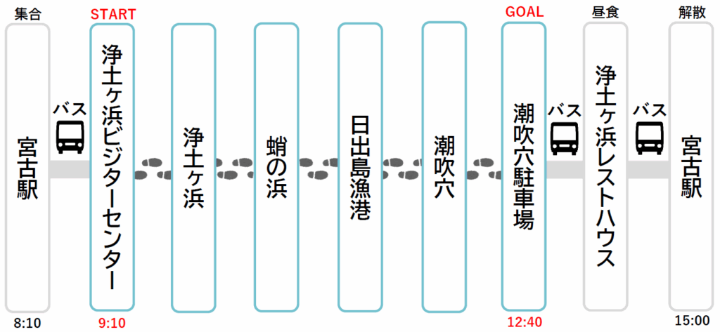 浄土ヶ浜~潮吹穴コース 歩行時間 3時間30分